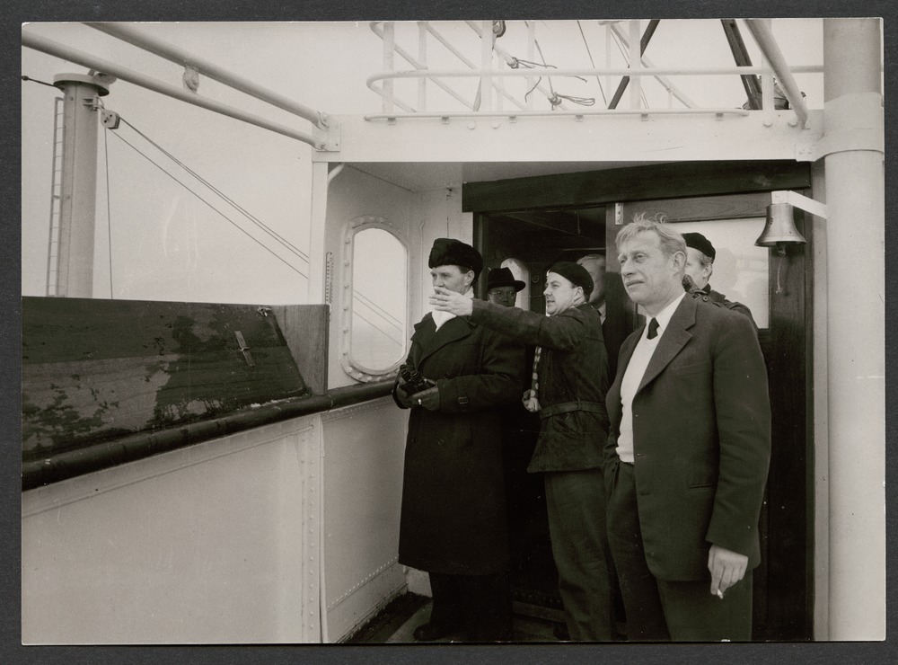 Bilden föreställer några män ombord på fartygsbrygga, någon pekar och berättar.