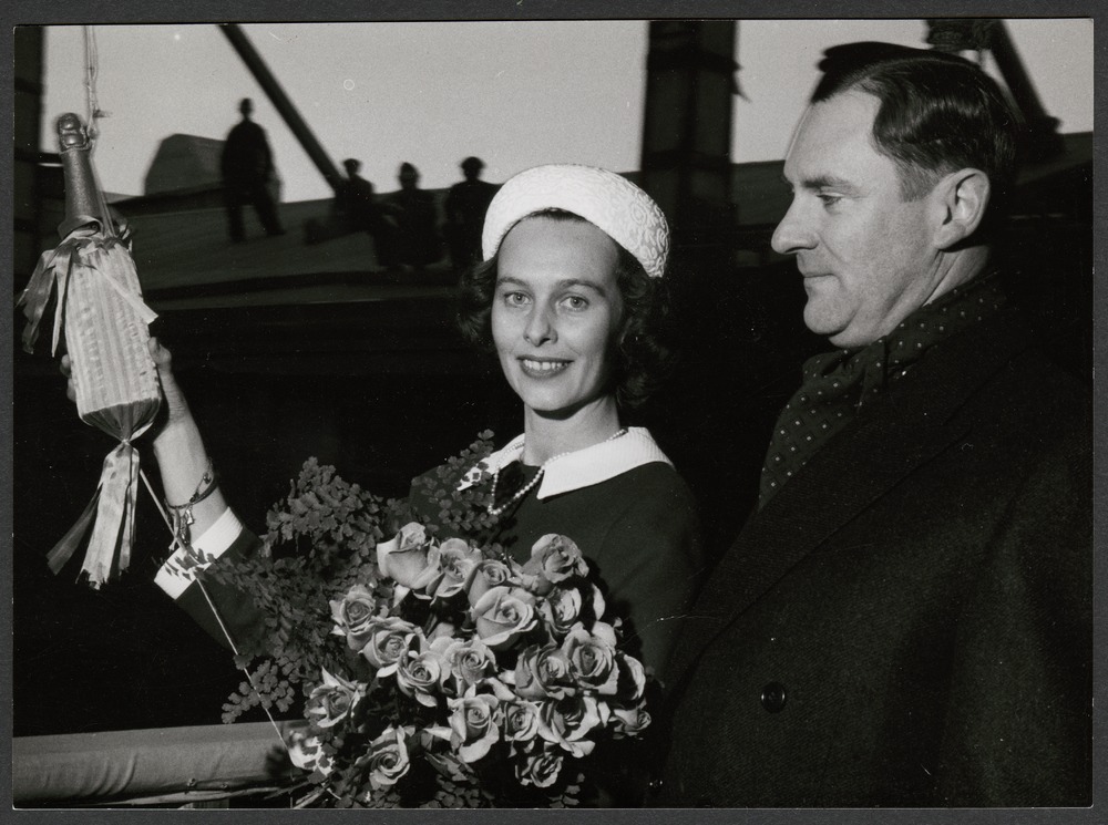 Bilden föreställer en man och vid hans sida en kvinna med blombukett i ena handen och en flaska i ett snöre i andra handen. Fartygsdop