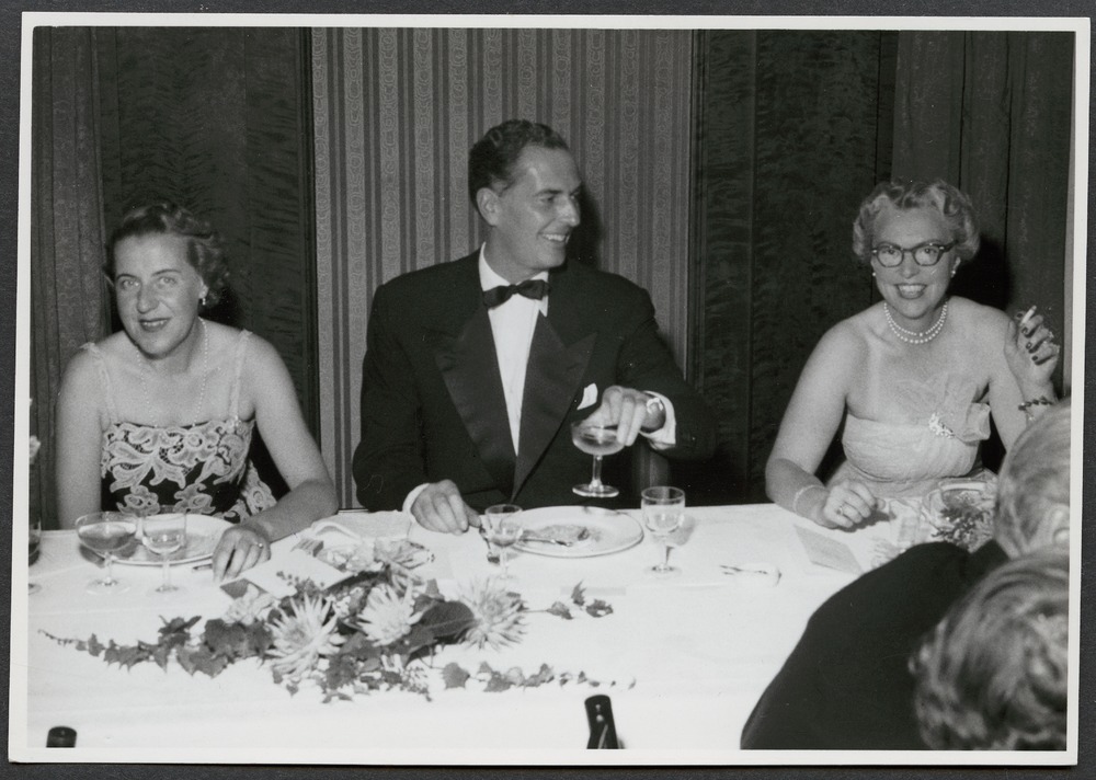 Bilden föreställer två damer och en man sittandes tillbords på en fest.