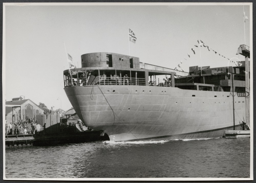 norskflaggat ej färdigbyggt fartyg glider ner i hamnen
