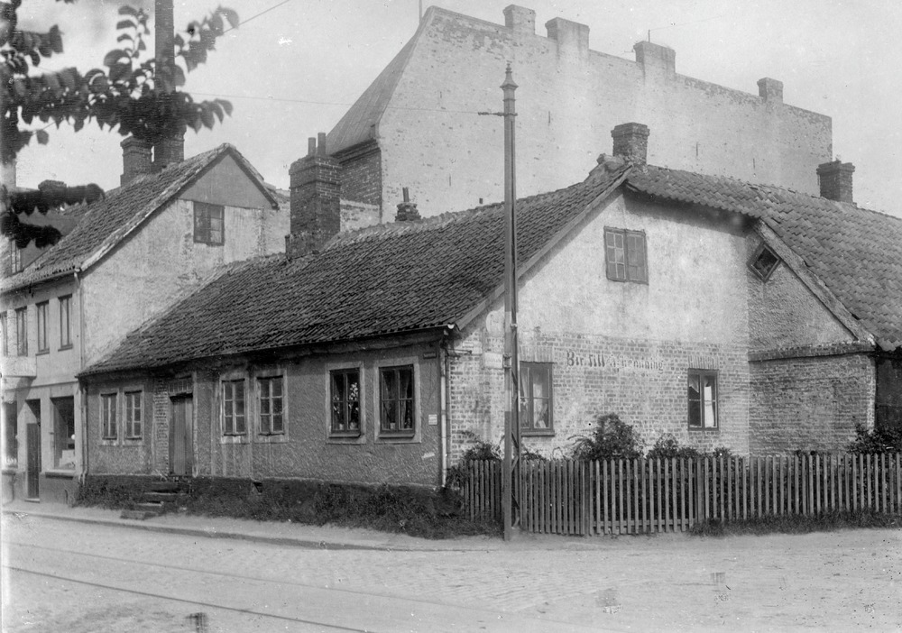 Bilden föreställer hörnet af Södergatan och Ramlösavägen 1907. I förgrunden stenlagdgata med spårvagnsräls och med trottoar. I bakgrunden enplans- och flerplanshus. Till höger ett staket med buskar bakom. Liten trappa upp till en dörr.
