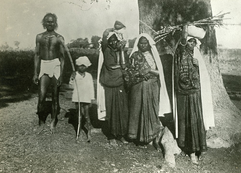 En man och tre kvinnor och barn (I Etnografiska står det: Infödingar. Calcutta. Kvinnan till höger bär en knippe käppar eller rör på huvudet. Hon har flera armband, den andra till vänster med flera armband av metall eller silver. I allmänhet bär alla kvinnor armband om armar eller fotleder då de icke behöver betala skatt. Kvinnan längst till vänster har sin unge på axeln eljest bruka de sitta grensle över höften. Mär k de synnerligen smala benen, utmärkande för alla indier även för schikerna som i övrigt äro kraftfullt växta och väl utvecklade.)*