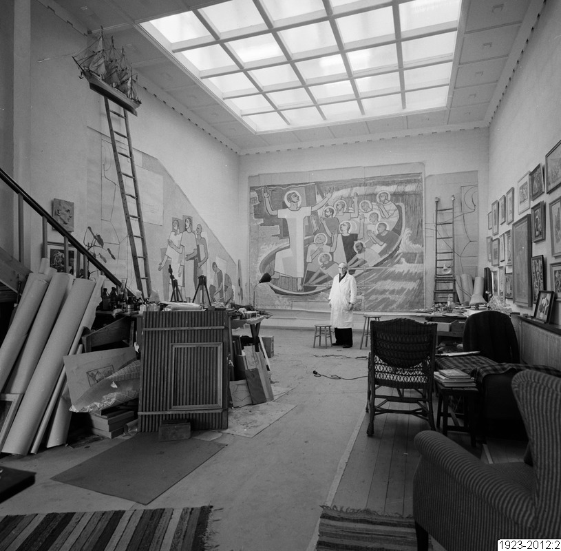 Konstnär Pär Siegårds atelje. Bakom Siegård syns verket "Jesus stillar stormen" som sedan placerdes i Förslövs kyrka