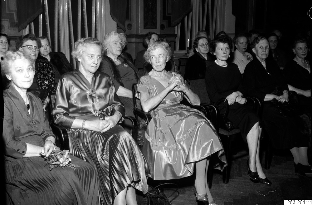Fredrika Bremerförbundets lokalavdelning i Helsingborg har 50-års jubileum på Hotel Astoria. Längst till vänster Signe Wennberg, bredvid henne Hanna Rydh och därefter Elsa Ewerlöf, förbundsordförande för Fredrika Bremerförbundet