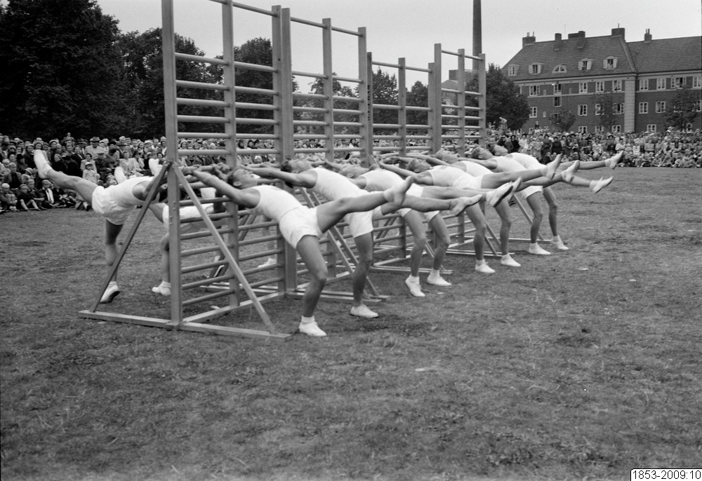 Beskrivning: Gymnastikuppvisning på Furutorpspatsen.