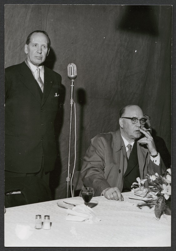 från middagsbjudning, möjligen i samband med namngivning av "Inga". En man står vid en mikrofon, till höger om honom sitter en annan man. Ett vinglas samt peppar och salt står kvar på bordet.