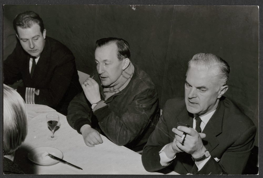 från middagsbjudning, möjligen i samband med namngivning. Tre herrar sitter vid ett bord, två röker.