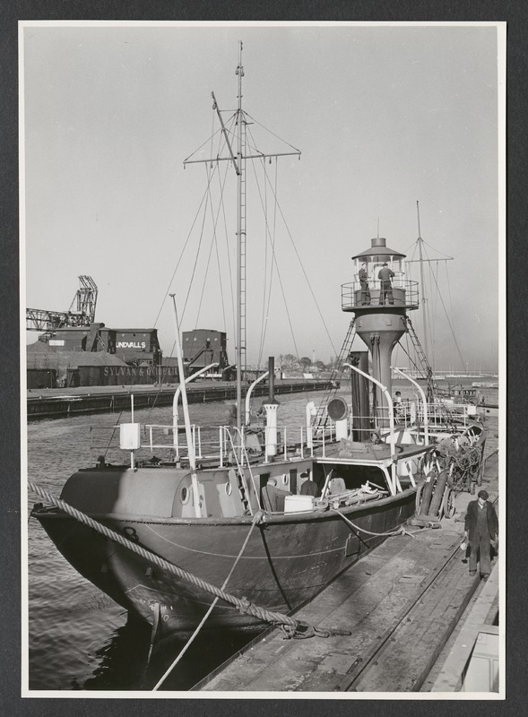 Bilden föreställer ett fyrskepp liggandes vid en kaj. I bakgrunden hamn.