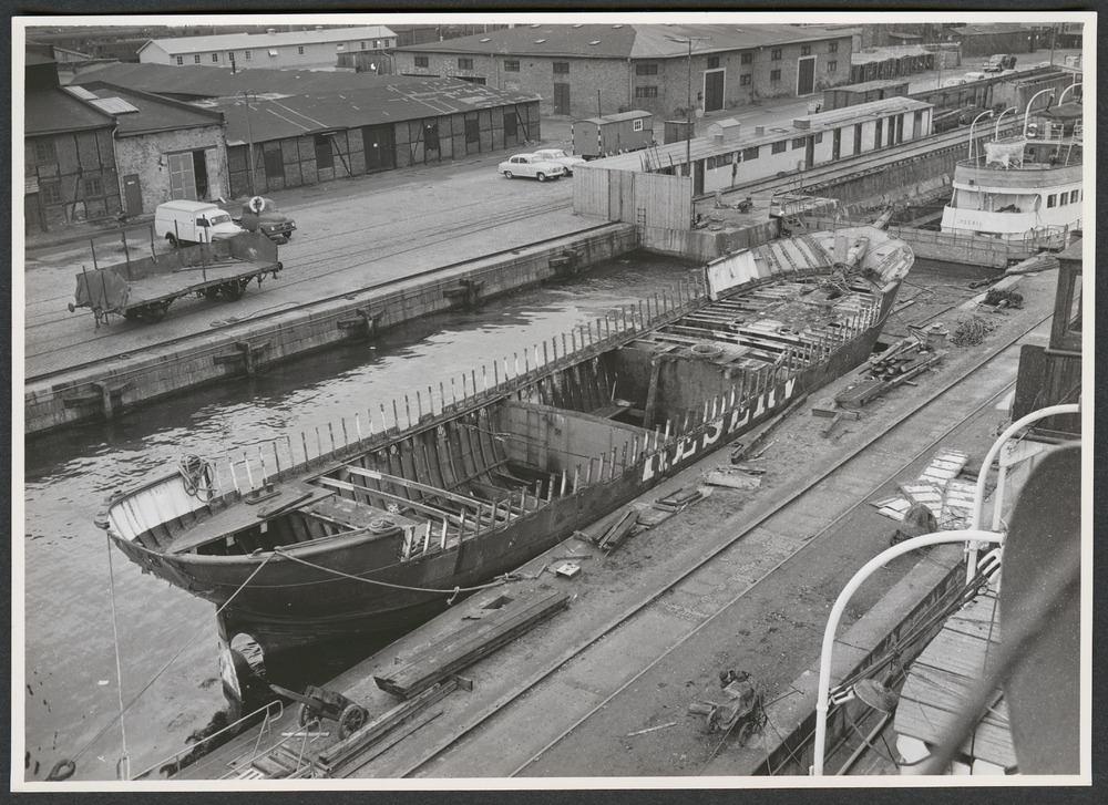 Bilden föreställer skalet på ett fyrskepp liggandes troligen på ett varv vid en kaj. I bakgrunden byggnader och parkerade bilar