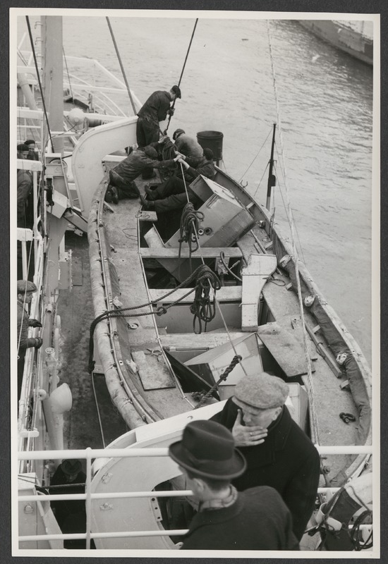 Bilden föreställer en räddningsbåt, livbåt uppe på ett fartyg där befinner sig också några sjömän.