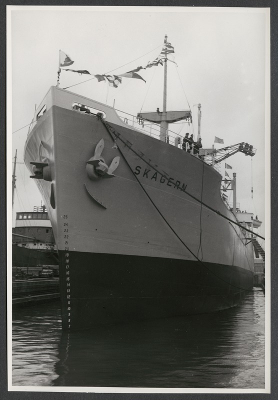 Bilden föreställer fören på ett fartyg med namnet Skagern i en hamn