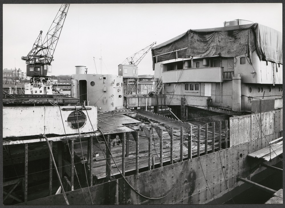 Bilden föreställer sidan på ett fartyg där plåtarna är borta och reglarna syns i bakgrunden kommandobryggan övertäckt med en pressening. Ytterligare bakom lyftkranar.