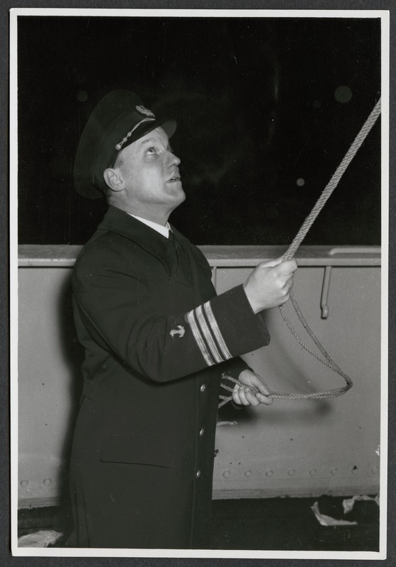 Bilden föreställer en man i sjökaptens uniform som står och håller i en lina när det är mörkt ute. Mannen är i trekvartsformat