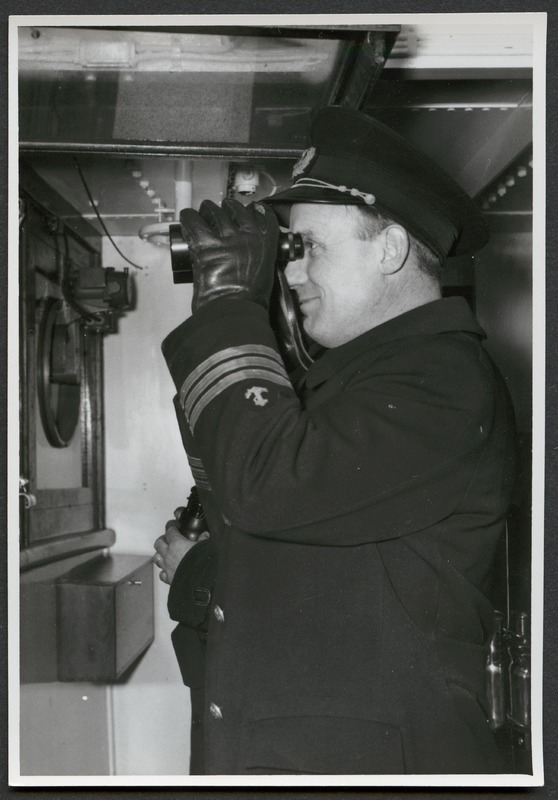 Bilden föreställer en man fotograferad i profil och halvformat. Mannen tittar i en kikare och står troligen på en kommandobrygga.