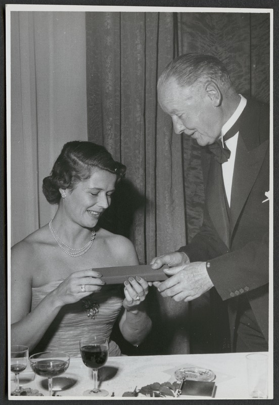 Bilden föreställer en kvinna som frå en present av en man vid ett festdukat bord.