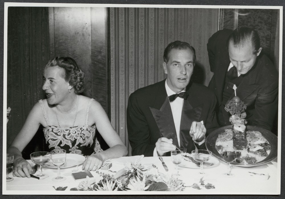Bilden föreställer en kvinna och två män sittandes till bords på en fest