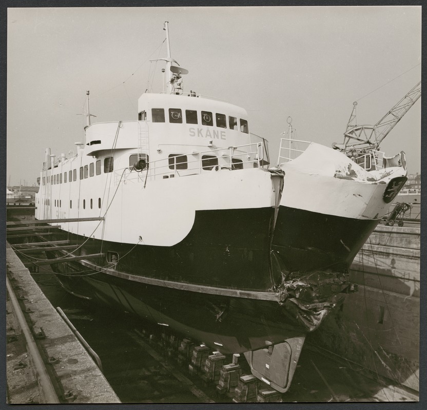 Bilden föreställerett fartyg sett från fören i en torrdocka. Fören ser demolerad ut.