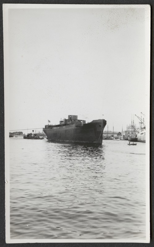 Bilden föreställer ett fartg på redden. I bakgrunden hamn.