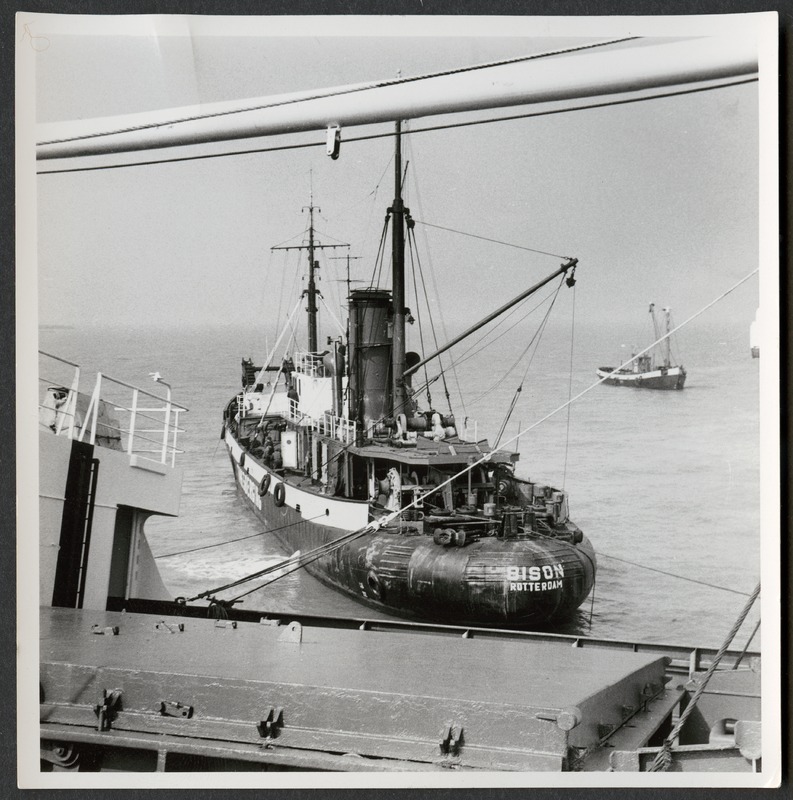 Bilden föreställer i förgrunden liten del av fartyg och där bakom en båt med texten Bison Rotterdam. I bakgrunden ytterligare båt.