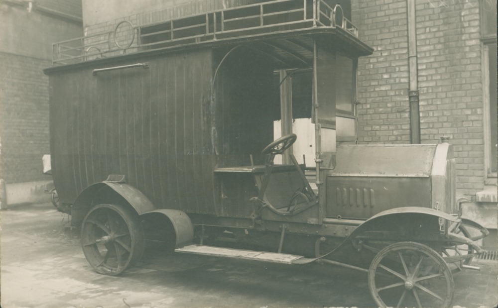 Liten lastbil med helt inbyggt flak. Tak över förarsätet samt framruta. Ovanpå taket metallram.