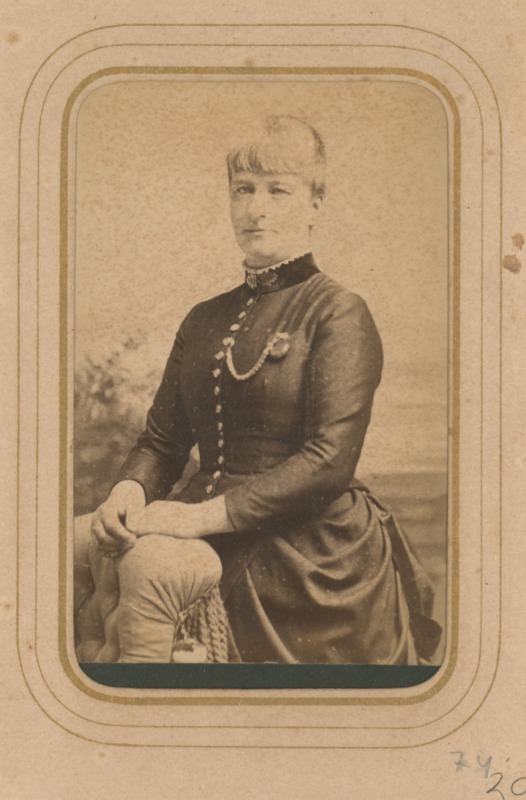 Porträtt på okänd kvinna. På bröstet hänger en klocka i kedja.