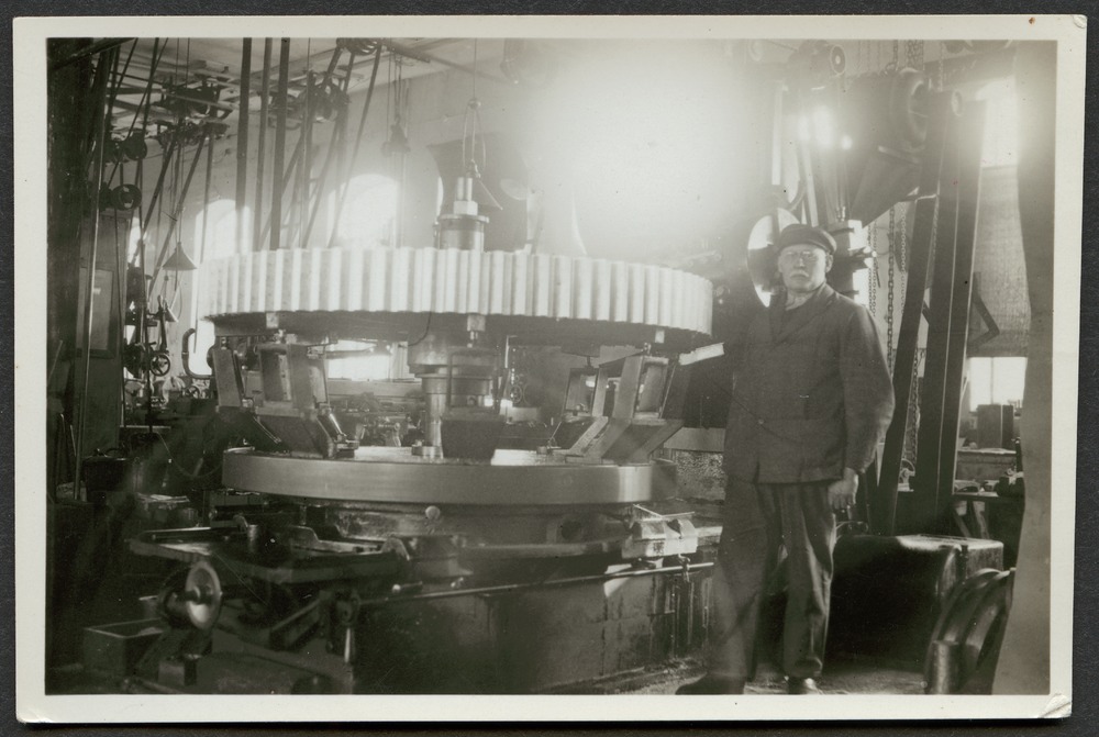 foto av fartygsmaskin, tillverkad för att användas på däck eller i maskinrum på fartyg. En man står intill maskinen.