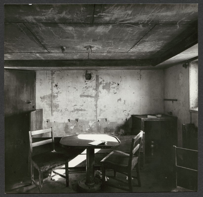 Bilden föreställer ett utrymme under däck med två stolat ett bord och ett skåp