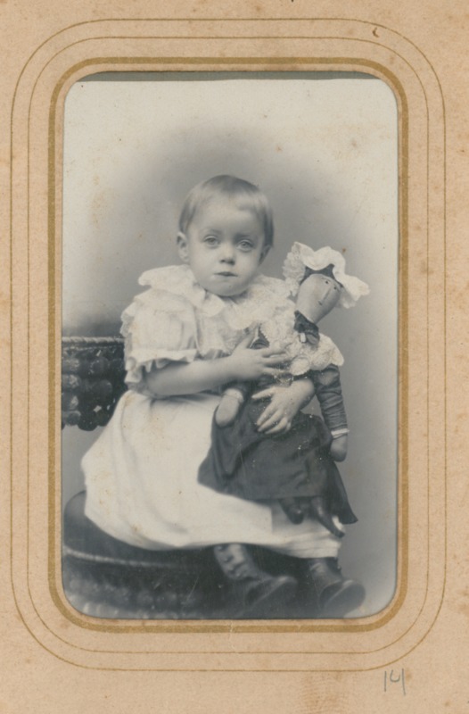 Porträtt på Ida Helfrid Alma Maria von Axelson som barn. I famnen har hon en docka.