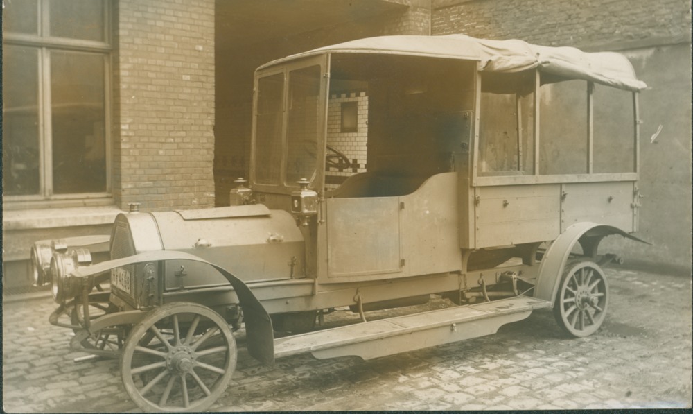 Liten lastbil. Förarhytt med tak och framruta. Flaket har träram nedtill och ställning upptill med presenning.