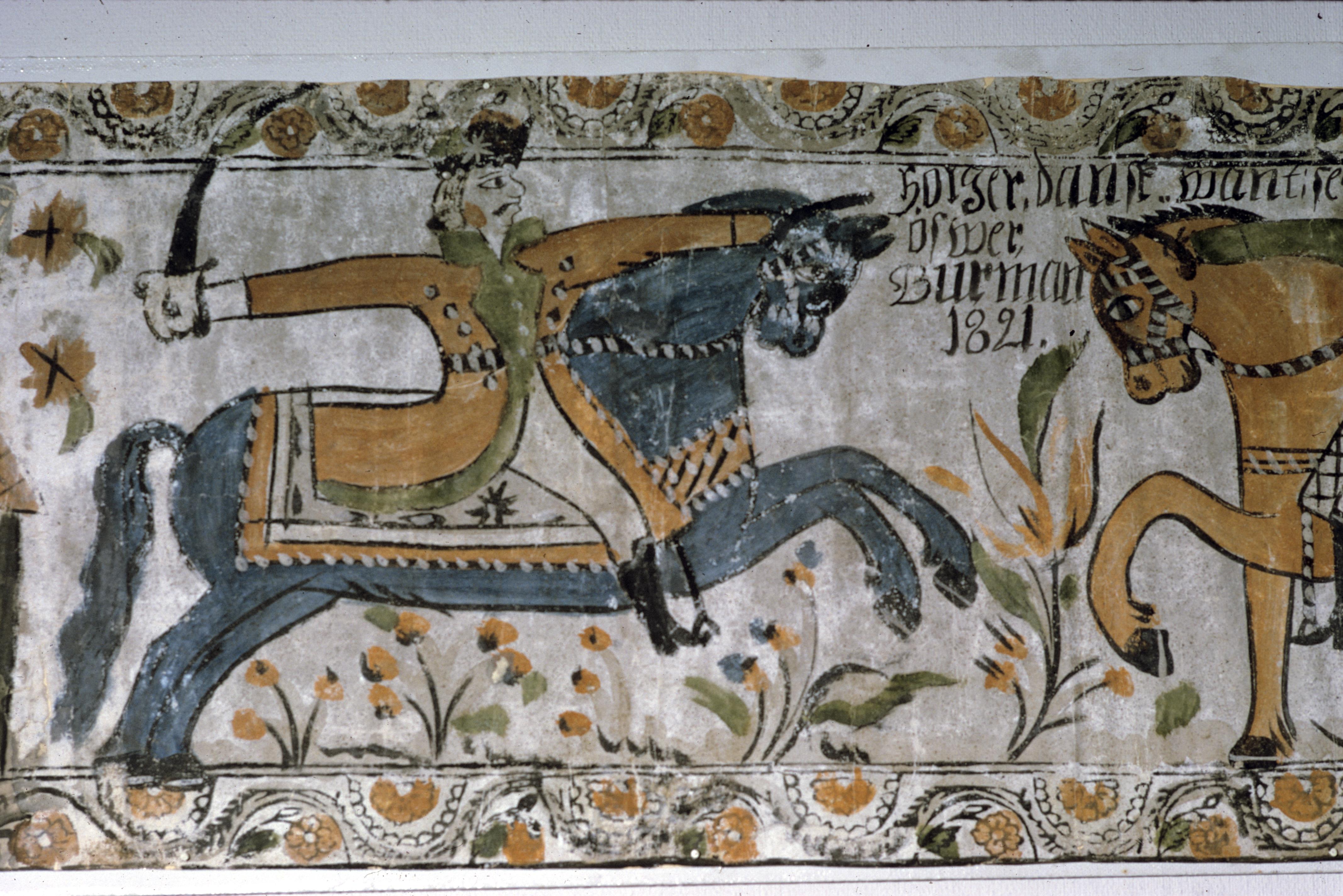 "Holger Dansk want seger öfwer Burman" en bonad av Carl Reinic Rosenberg 1821, med motiv från en omtyckt folksaga. Till bården har han använt tryckstockar.