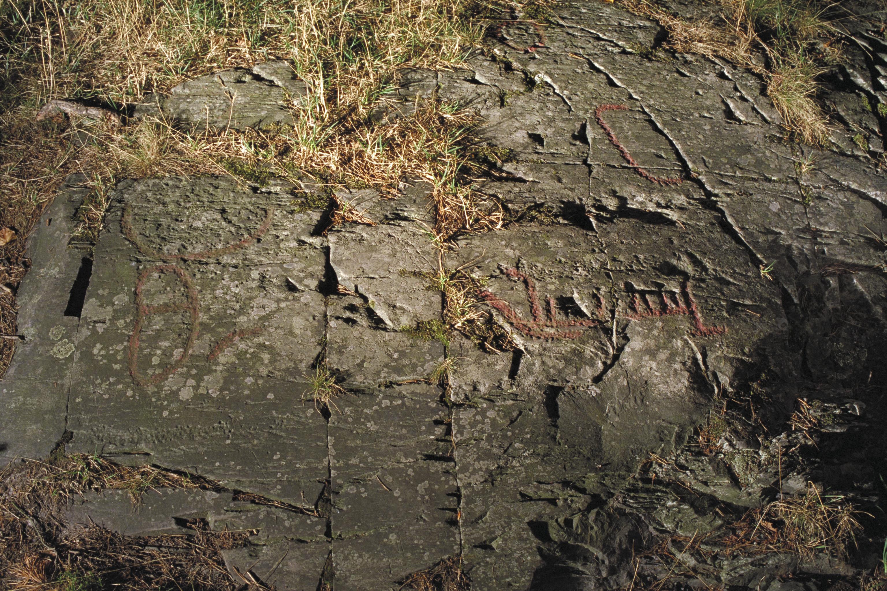 RAÄ-nummer Tisselskog 15:1. Hällens baksida. Skeppsfigur och fotsuefigur.