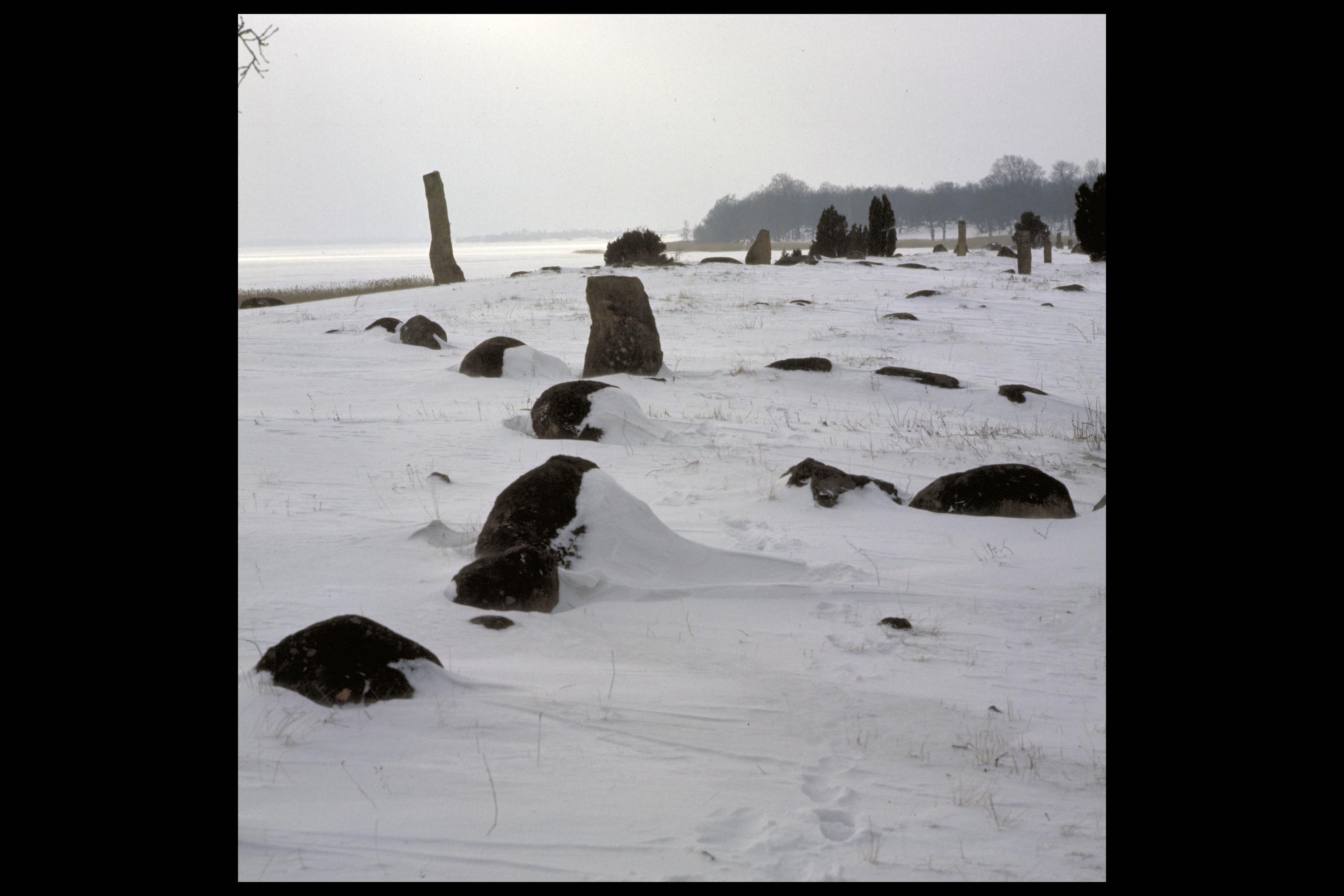 RAÄ-nummer Förkärla 12:1. Gravfält, bestående av 110 fornlämningar, vilka utgörs av stensättningar, skeppssättningar, treuddar, stenrader och resta stenar. Bilden troligen från omkring 1970.
