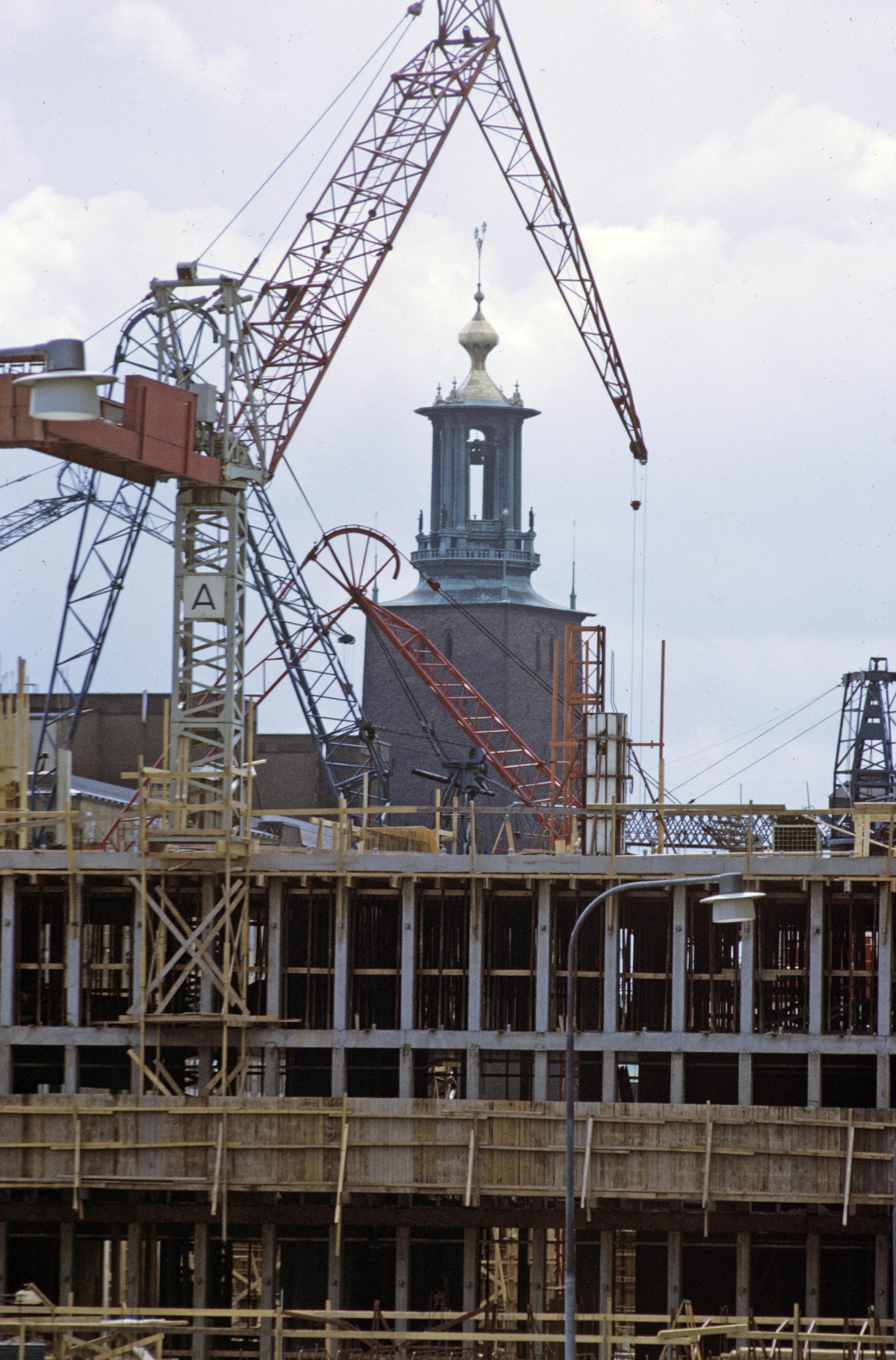 "Gropen", område med byggnadsarbeten på Nedre Norrmalm (Gamla Klarakvarteren), Stadshuset i bakgrunden. Bilden troligen från början av 1970-talet.