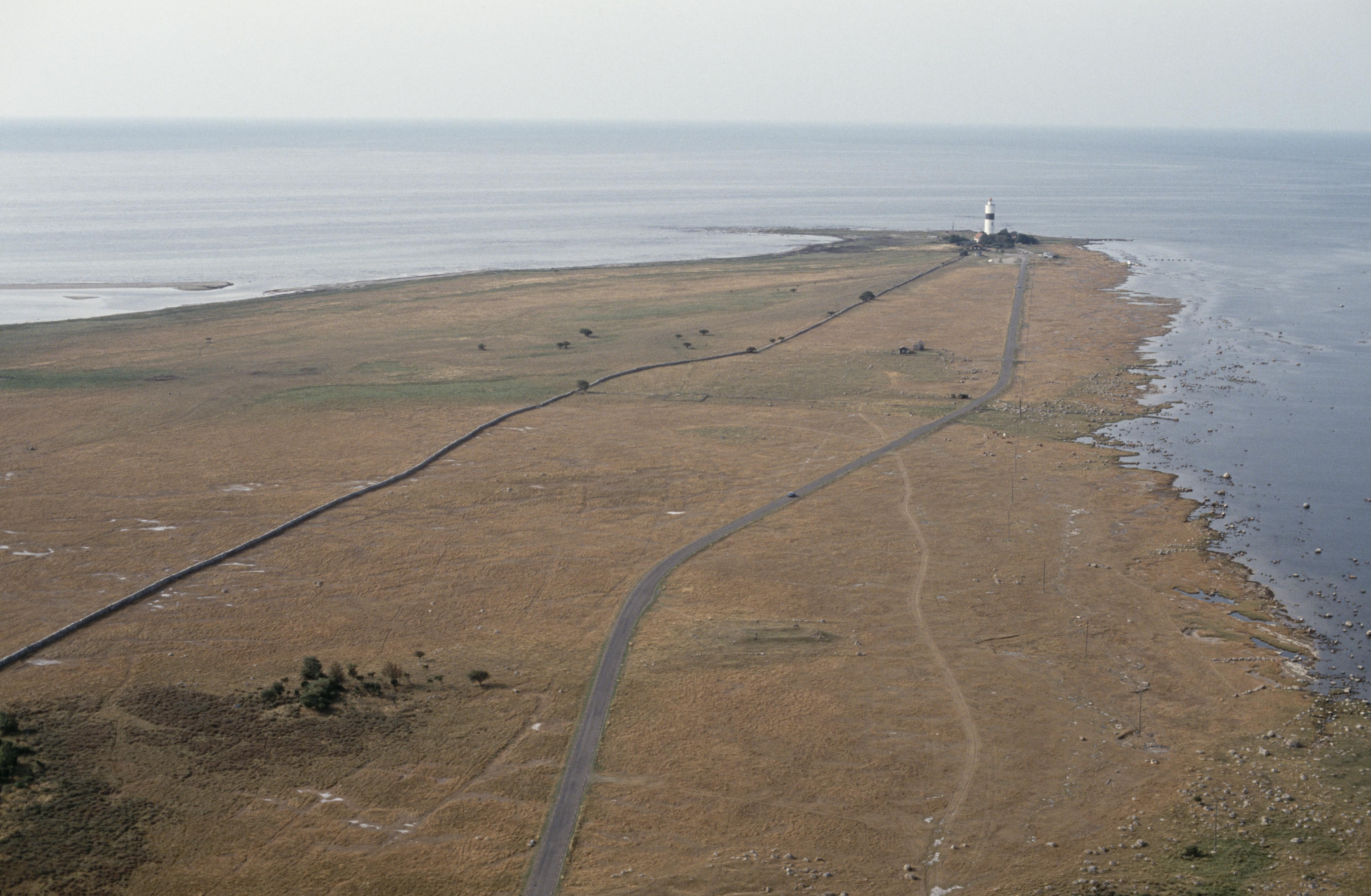 Sankt Johannes kapell (ruin) RAÄnr Ås 2:1 vid Kyrkhamn / Kapellviken. I bildens övre del fyrplatsen Långe Jan på Ölands södra udde. Bilden är tagen mot (väderstreck): S