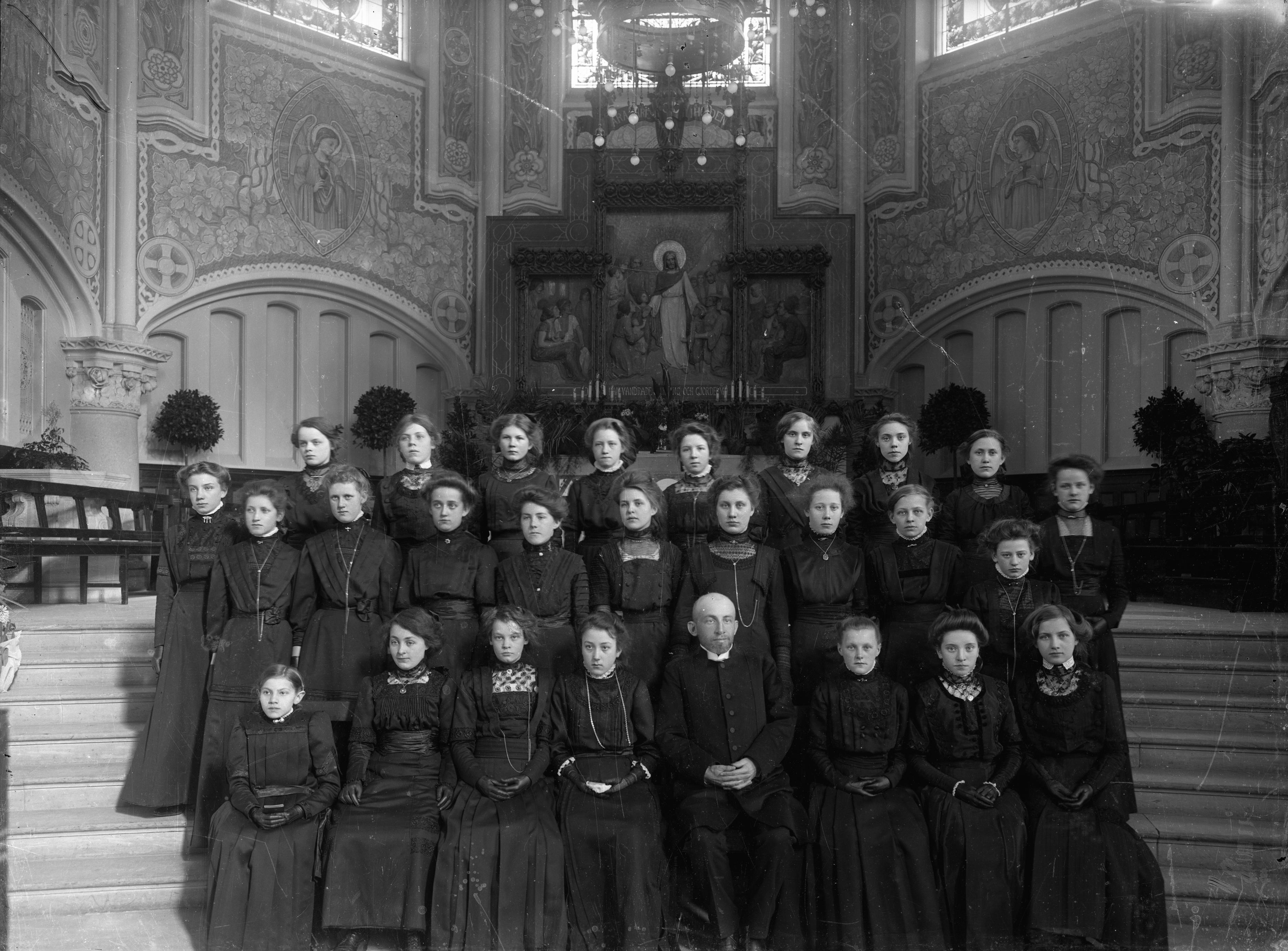 Konfirmander i kyrkan. Flickor, gruppuppställning