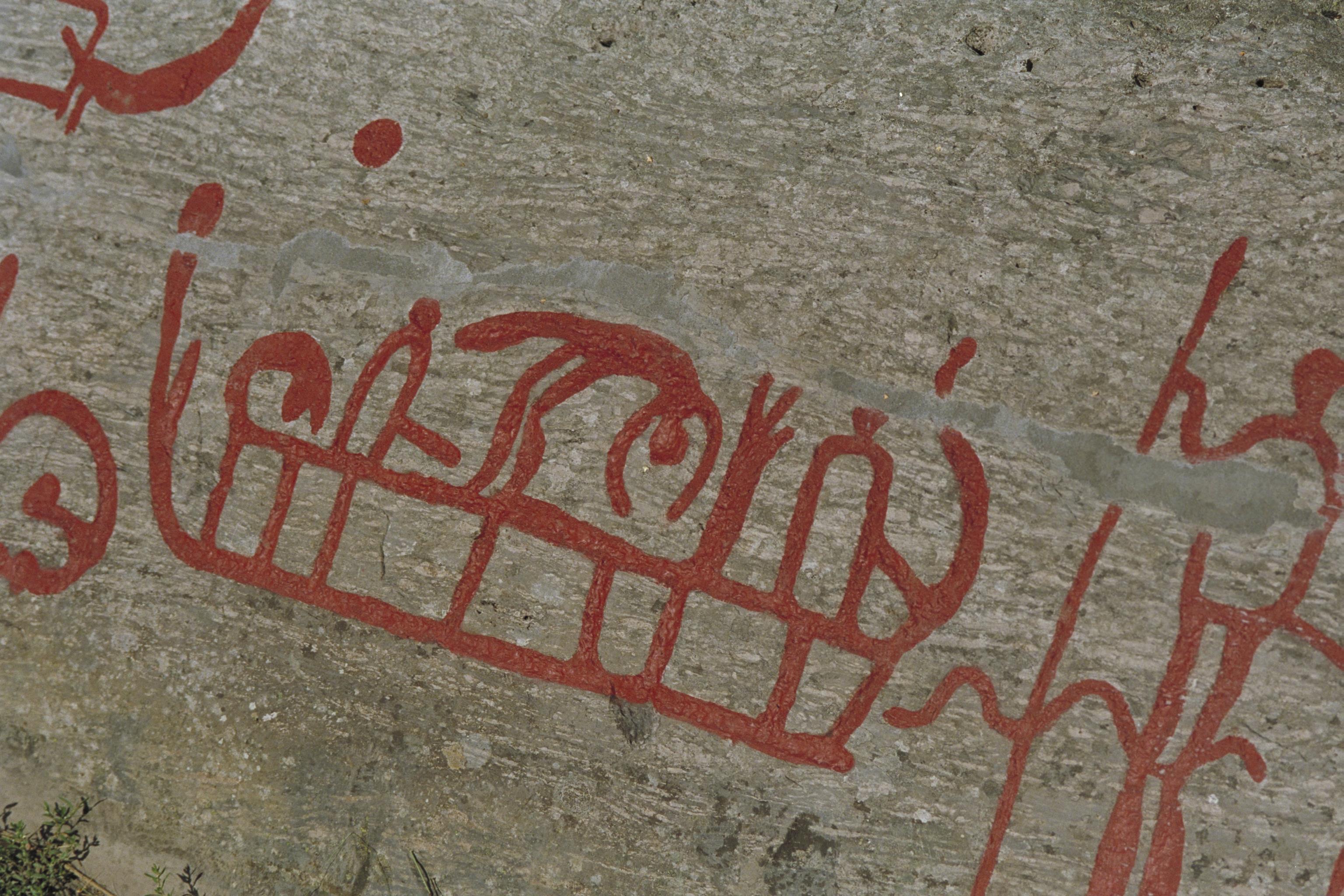 RAÄ-nummer Tisselskog 11:1. Processionshällen. Skeppsfigur med voltigör. Lagad häll.