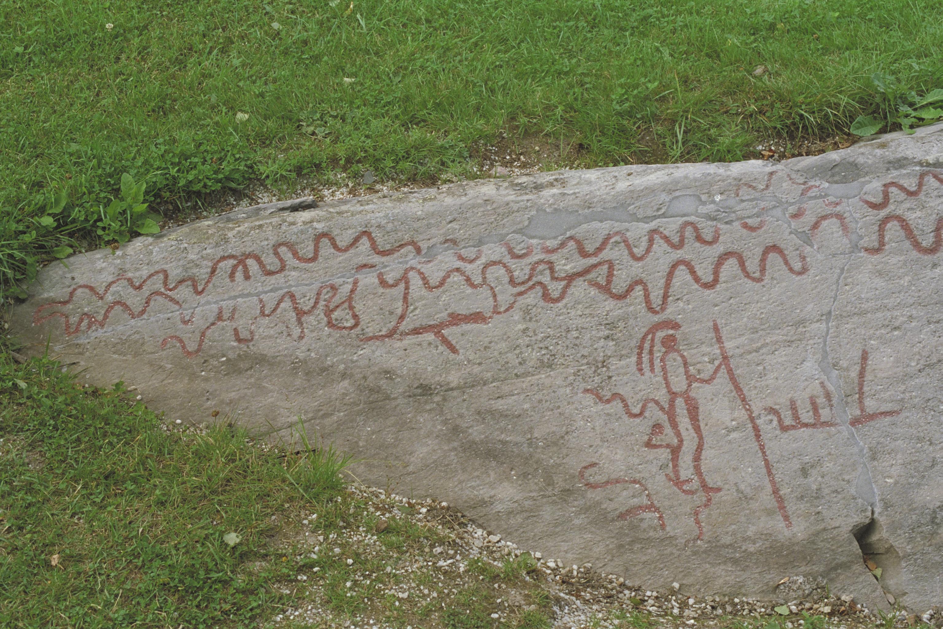 RAÄ-nummer Tisselskog 10:1. Krigarhällen. Människofigur med spjut och ormliknande figurer.