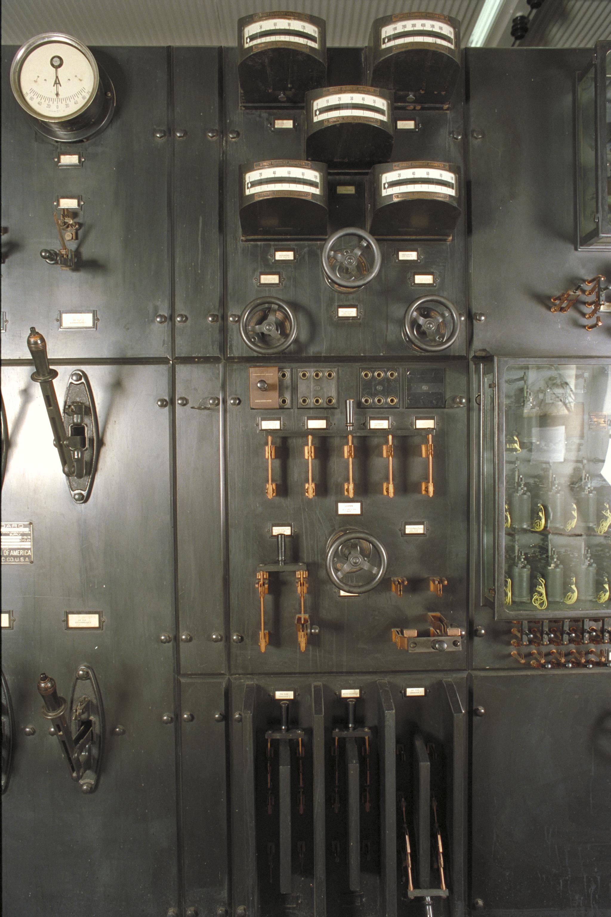 Ström- och spänningsmätare för 500/125 V generator. Mätuttag. Knivar för val av generator A el. B.Till vänster: Anordning för start och stopp av hjälpmaskiner