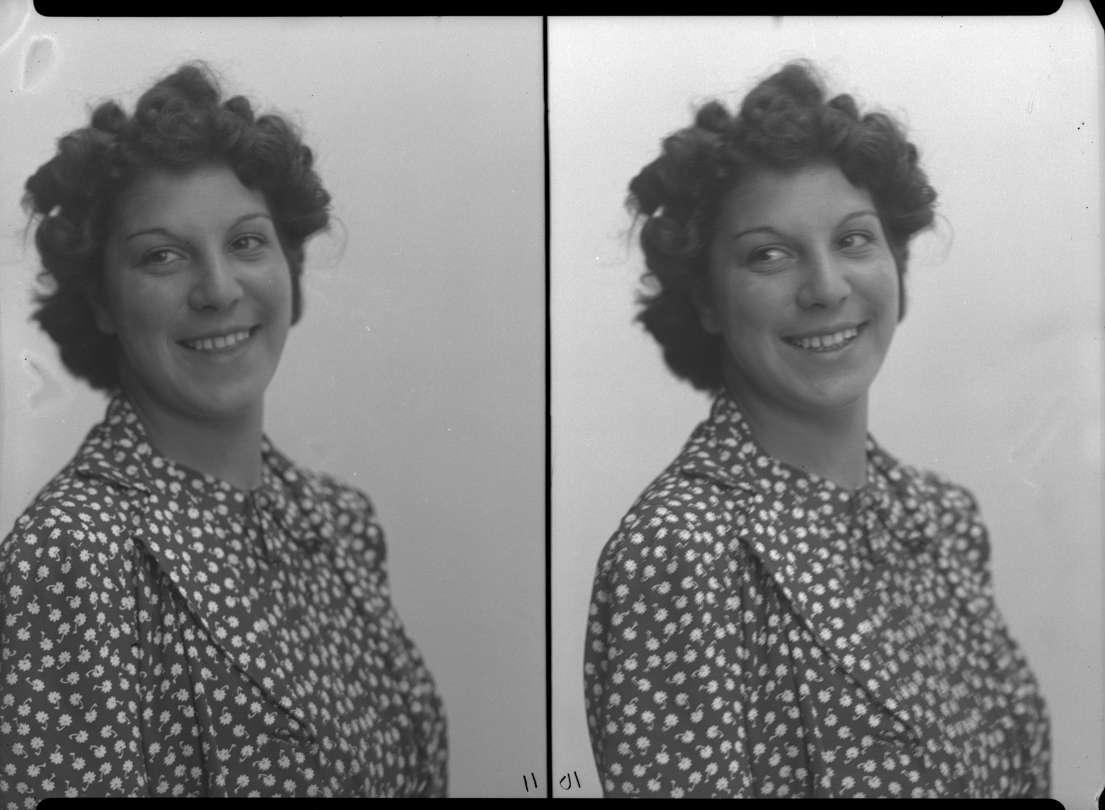 Porträtt, kvinna, 30- årsåldern, småmönstrad blus.