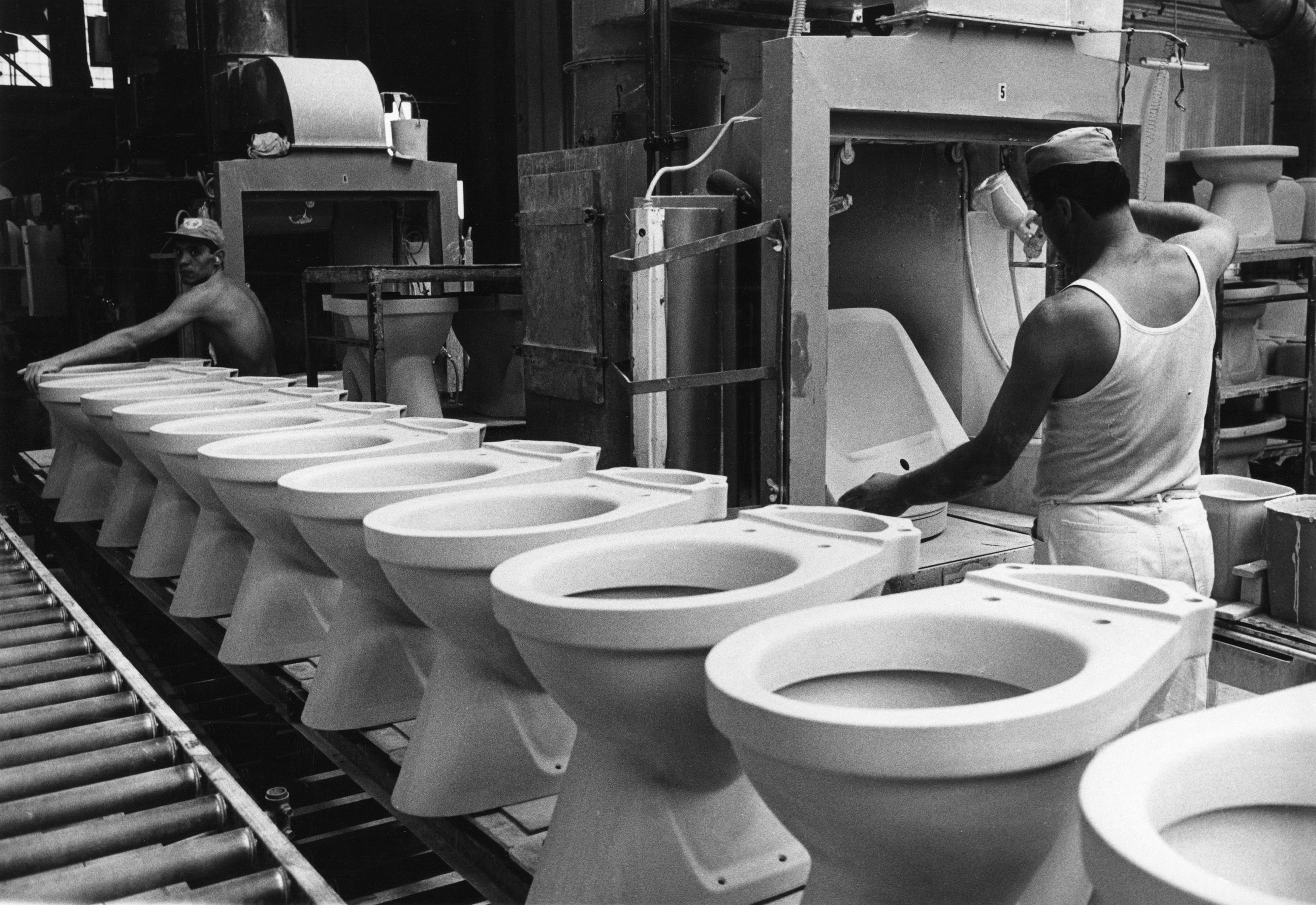 Tillverkning av sanitetsporslin. Bilden troligen från början av 1960-talet.