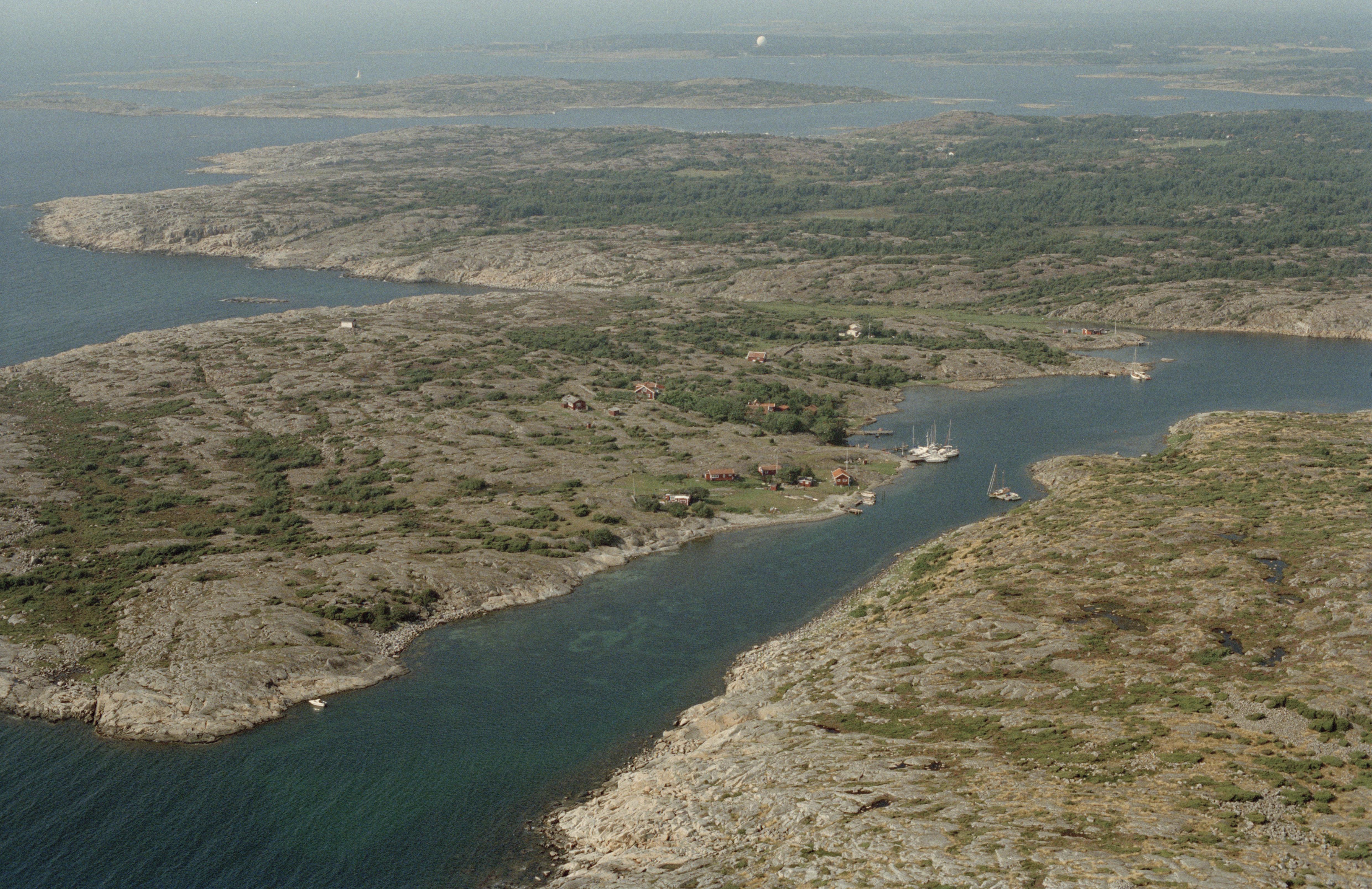 Mönster halvö till vänster och ön Hästholmen nere till höger. Lotsplats från 1700-talet. Labyrint RAÄnr Onsala 46:1, kyrkogård Onsala 45:1, röse Onsala 56:1 m.fl. Bilden är tagen mot (väderstreck): NV
