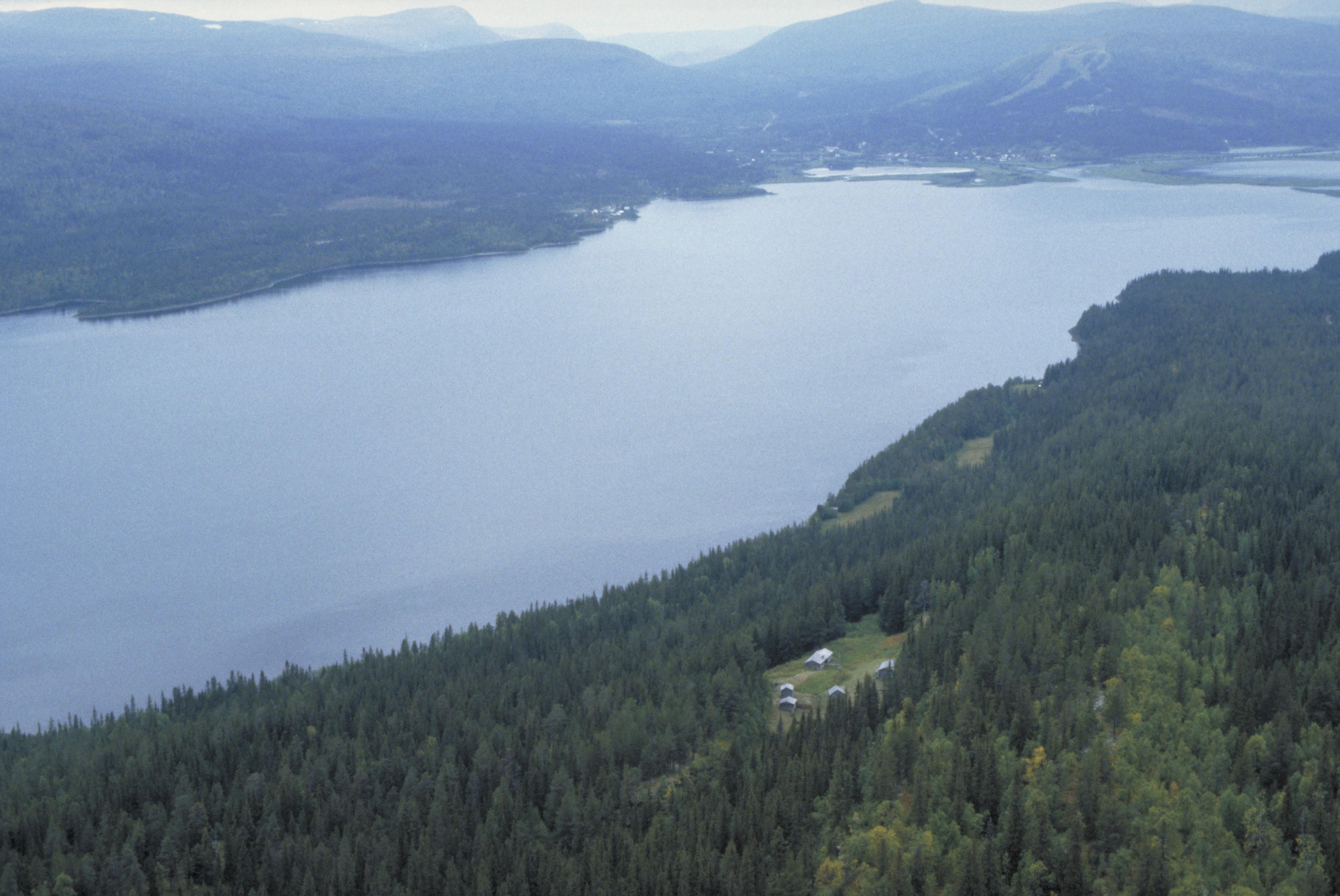 Nybyggargården Örnbo RAÄnr Sorsele 751:1 vid Ammarsnäs och sjön Gautsträsket. I bakgrunden Ammarnäsdeltat. Bilden är tagen mot (väderstreck): SV