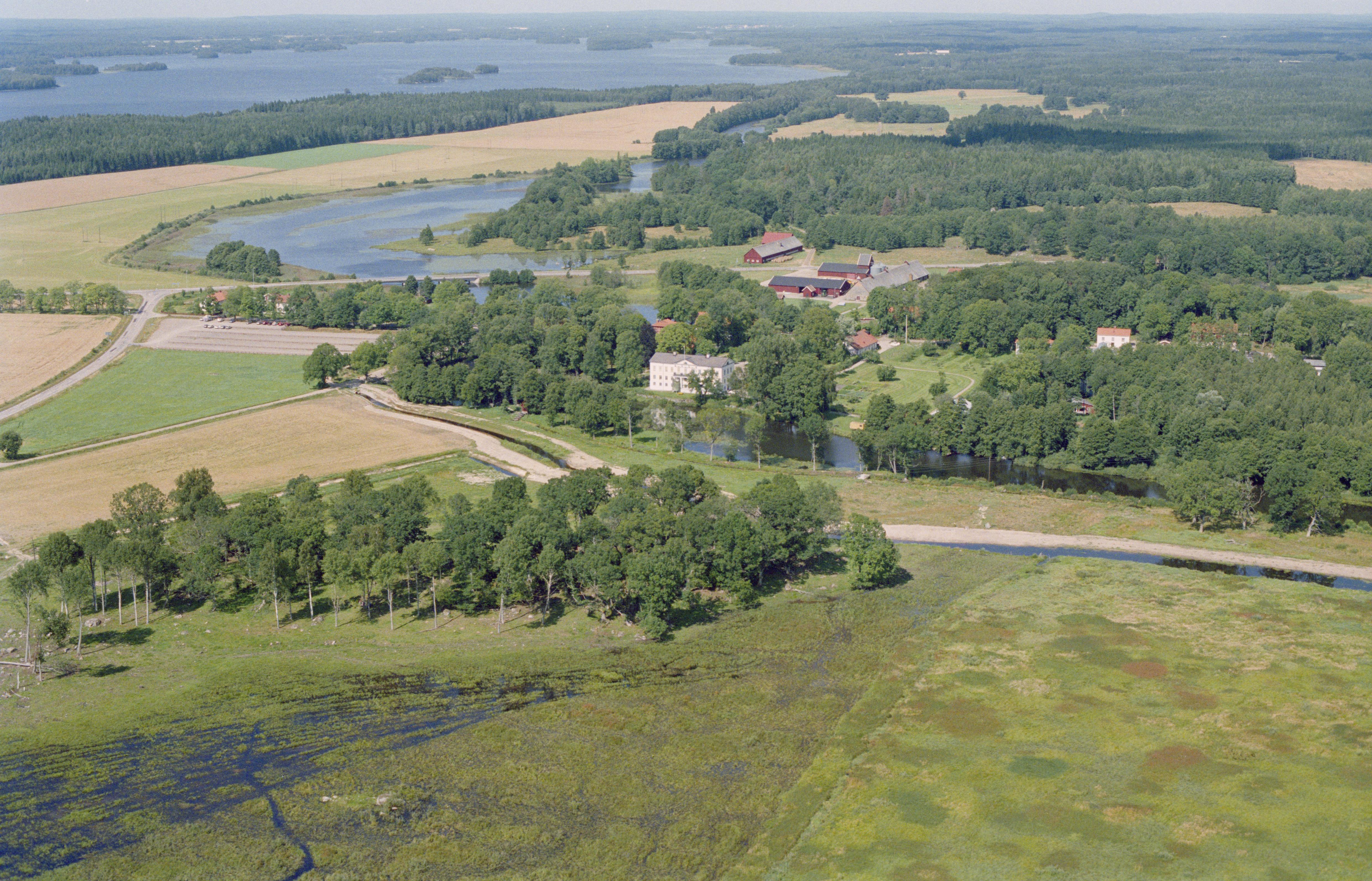Huseby bruk vid Helige å. Huseby herrgård vid bildens mitt. Bilden är tagen mot (väderstreck): N