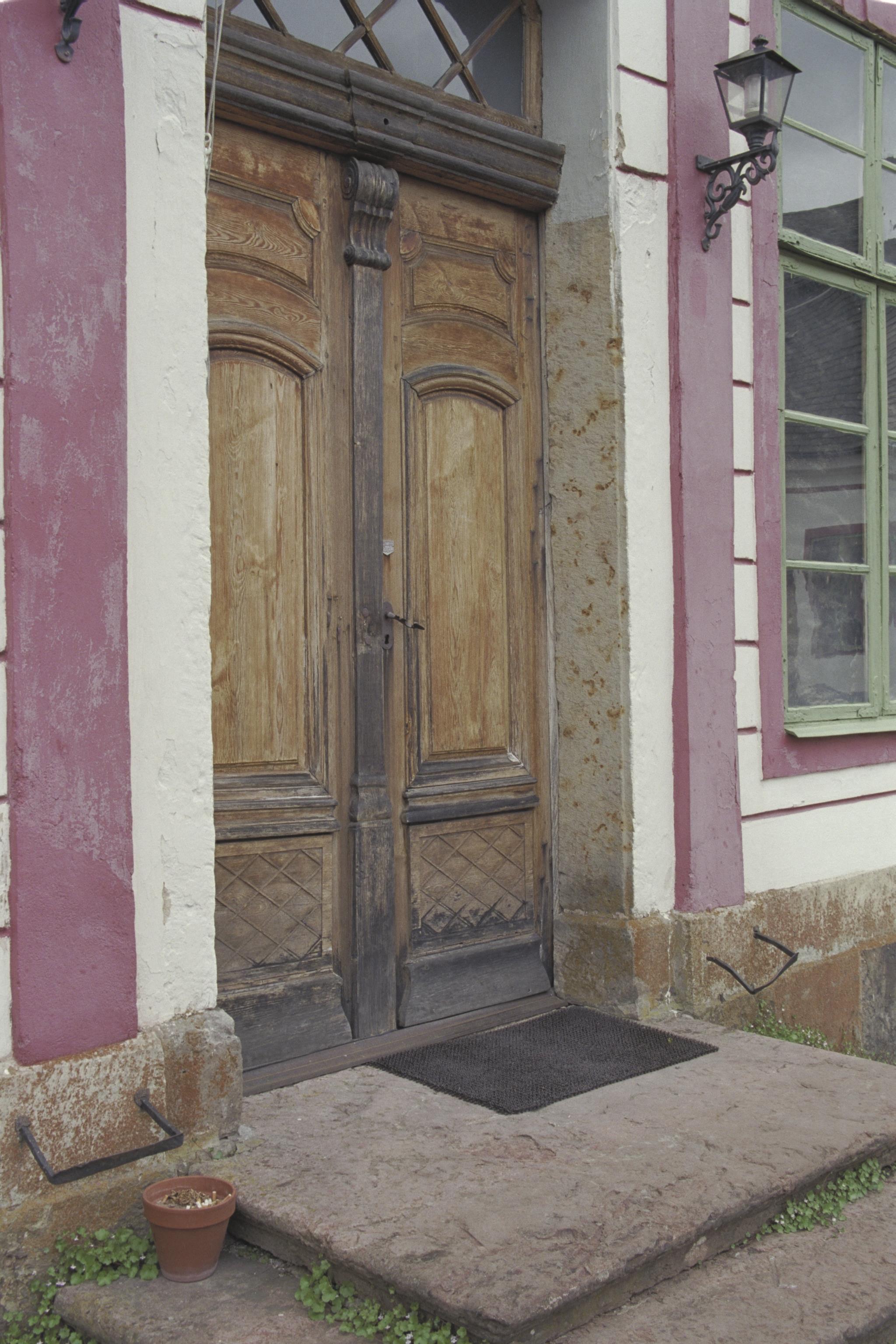 Huvudbyggnadens västra fasad, portomfattningens högra smyg.