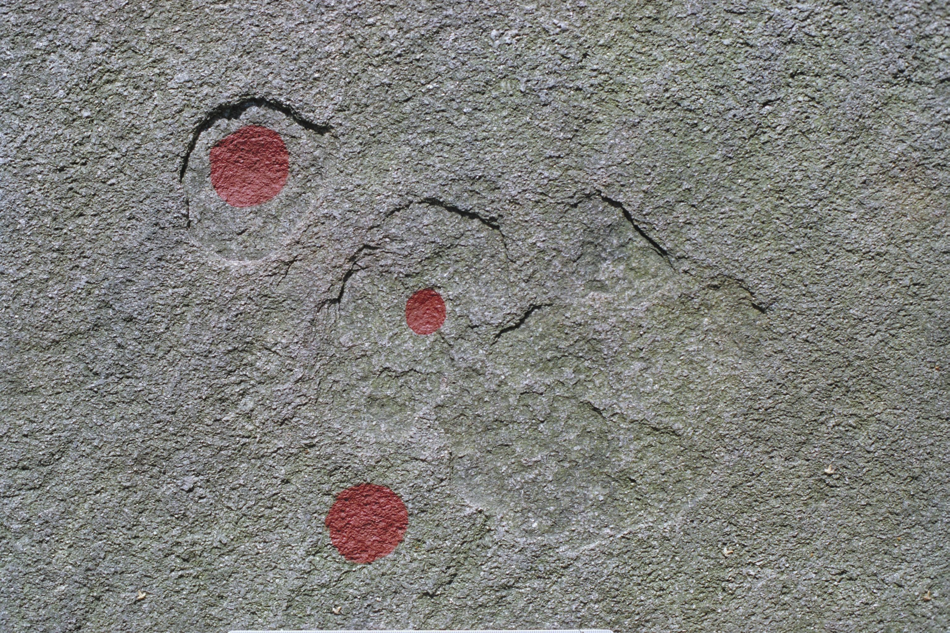 Skålgropar eller älvkvarnar på starkt vittrad häll. Tossene 73:1.