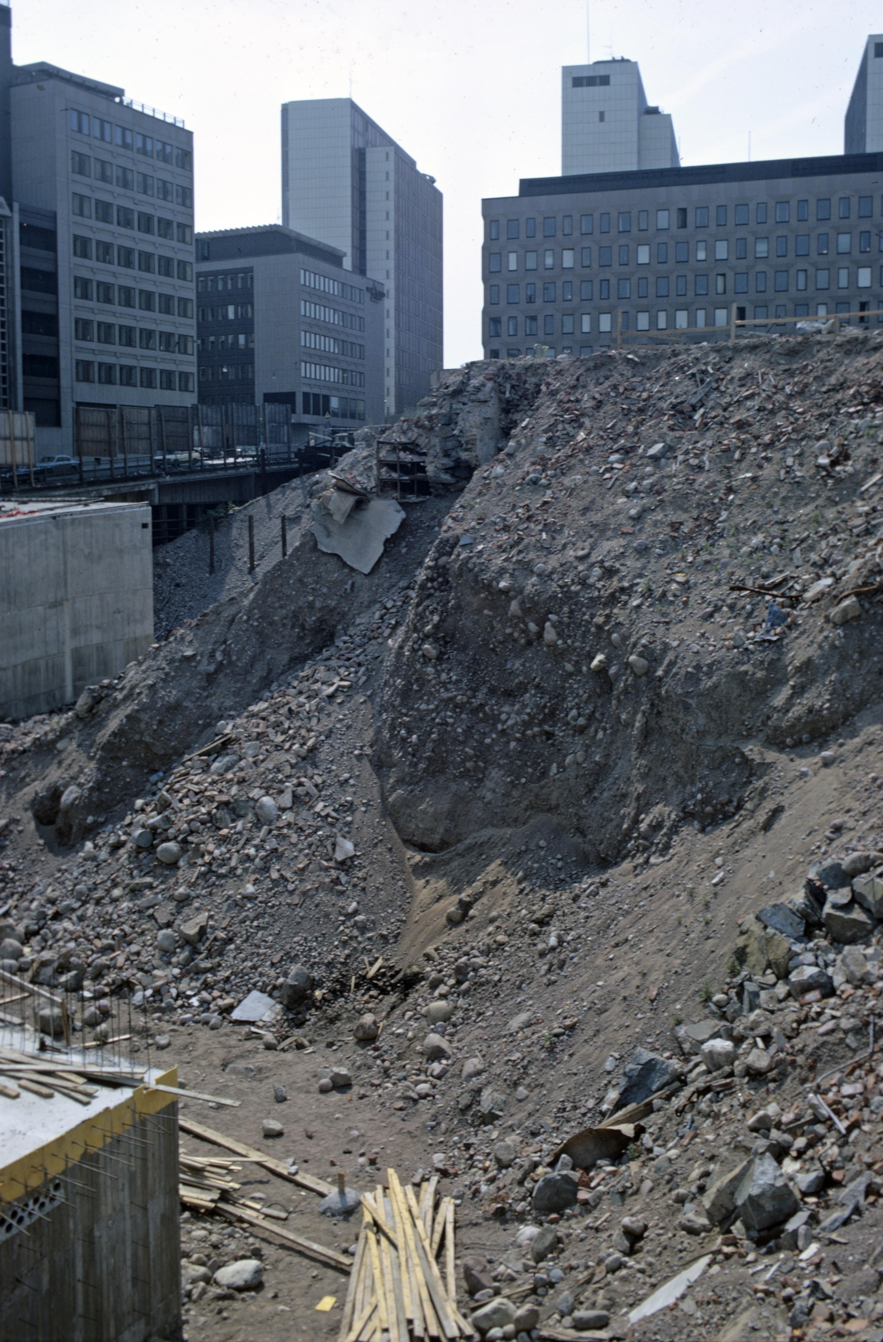 Beskrivning: "Gropen", område med byggnadsarbeten på Nedre Norrmalm (Gamla Klarakvarteren). Bilden troligen från början av 1970-talet.