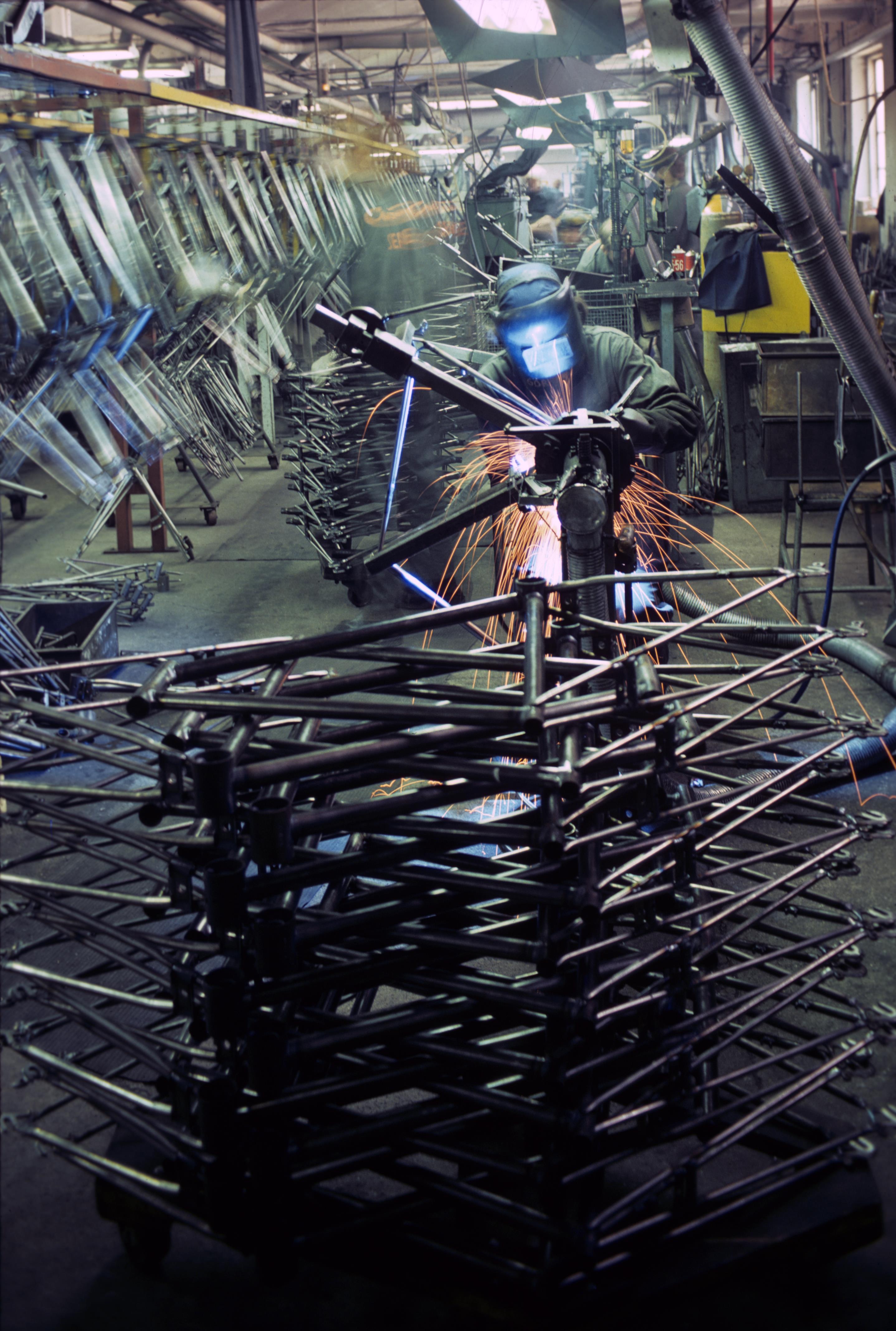 Tillverkning av cyklar. Bilden troligen från mitten av 1970-talet.