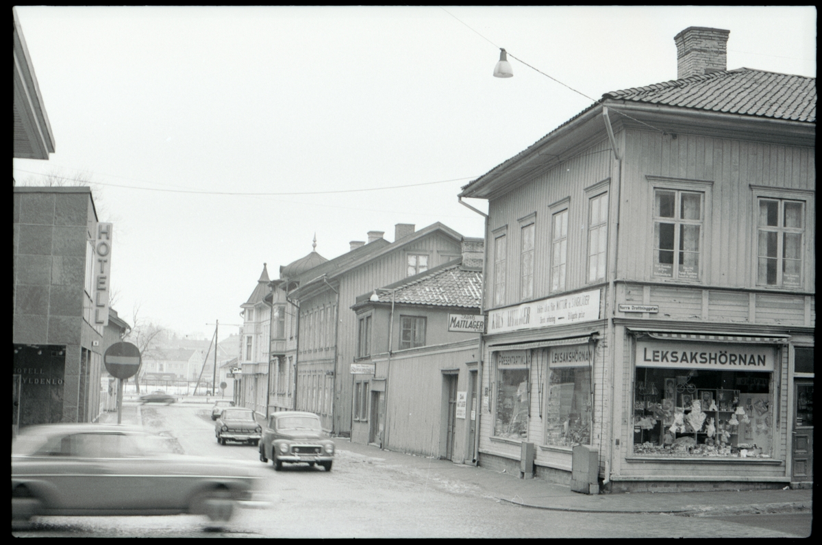Text till bilden: "Lagerbergsgatan- N:a Drottningsgatan. Leksakshörnan. Karls Mattlager. Sven Petterssons Rör". Album 1 bild 87.