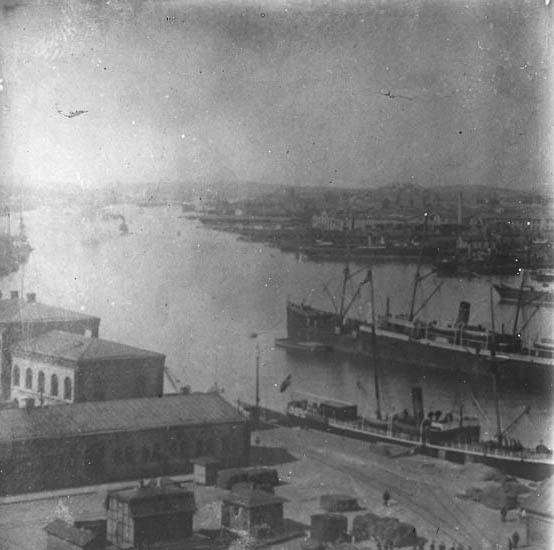 Inloppet till Göteborg taget från S:t. Eriks höjd. Till vänster nederst på bilden syns tullhuset. Något längre till vänster om bilden ligger stenbron, det är härifrån som vi skola begiva oss med en av Marstrandsbolagets båtar upp genom kusten.