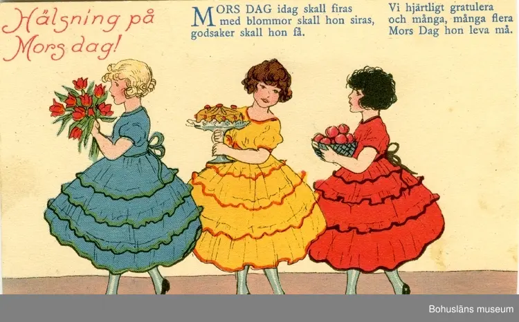 Kort: Hälsning på Mors dag! Mors dag idag skall firas med blommor skall hon siras, godsaker skall hon få. Vi hjärtligt gratulera och många, många fler Mors Dag hon leva må."